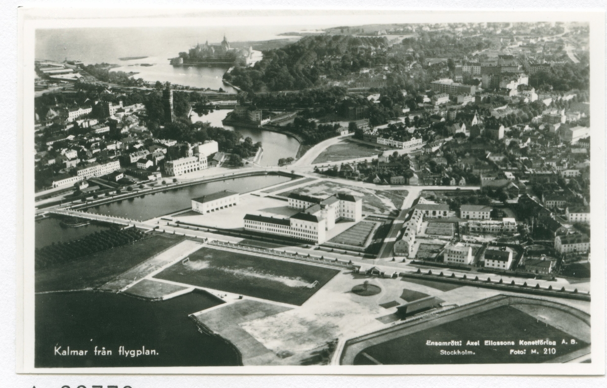 Flygfoto över Fredriksskans, Stagneliusskolan, brandstationen och slottet.