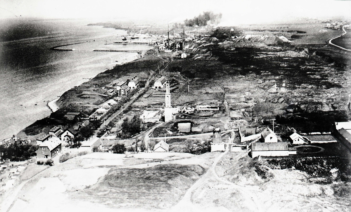 Titel: Vy med hamnen och cementfabriken i Degerhamn.