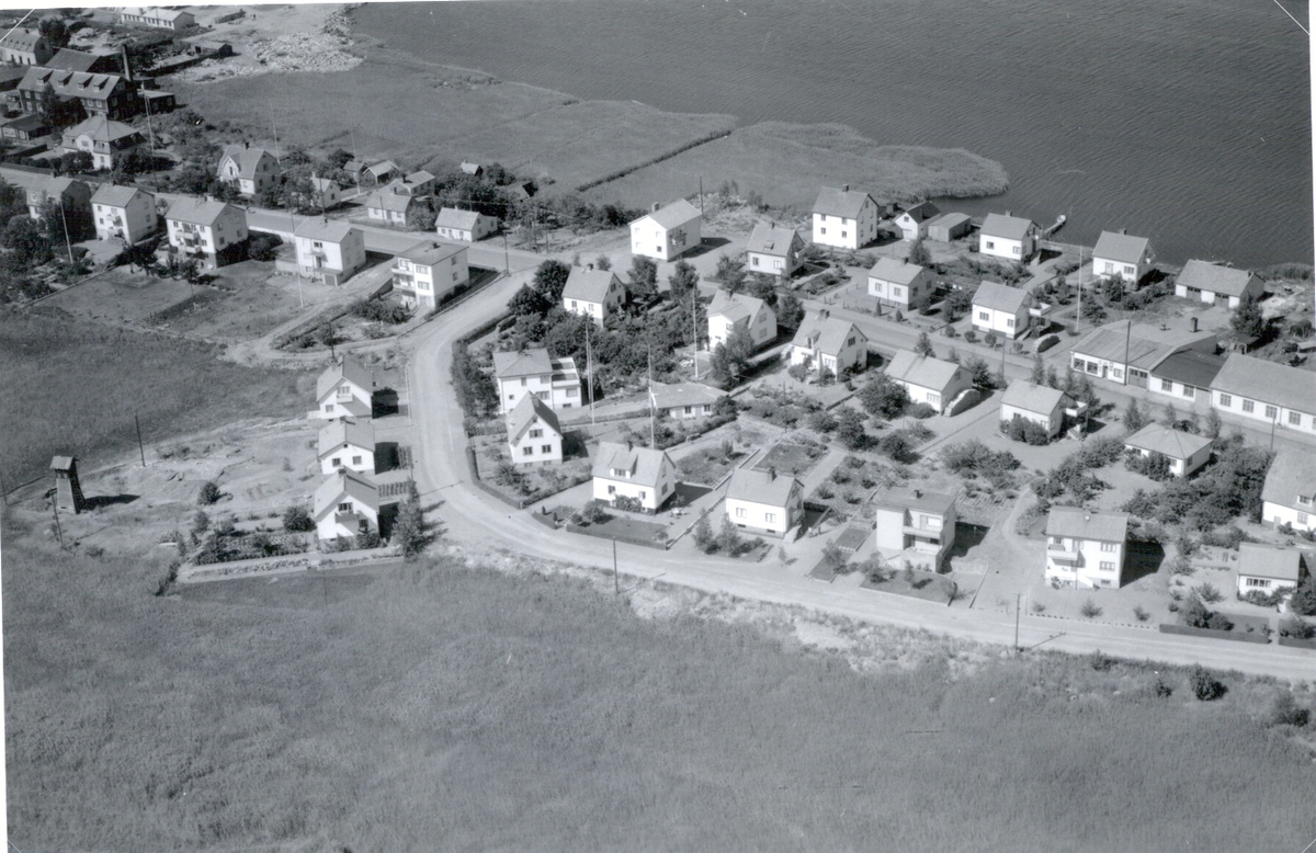 Flygfoto över Mönsterås med villaområde och Kalmarsund.