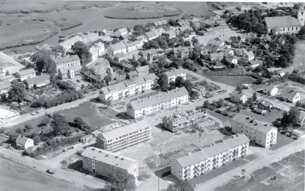 Flygfoto över Mönsterås med bostadshus och villor kyrkan uppe i högra hörnet i bild.