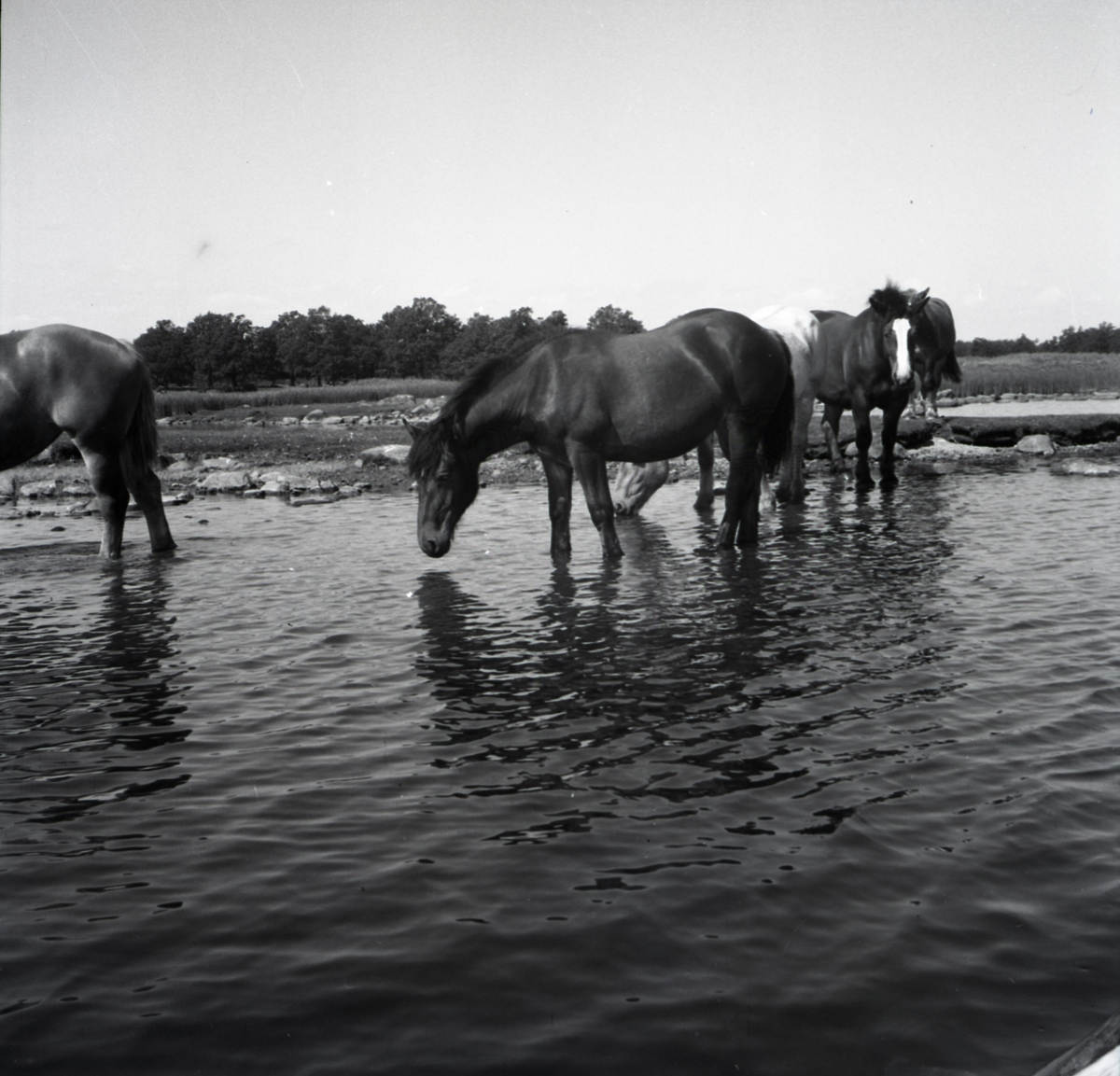 Welshponnyer från Wärnanäs-stuteri i vattnet vid stranden.