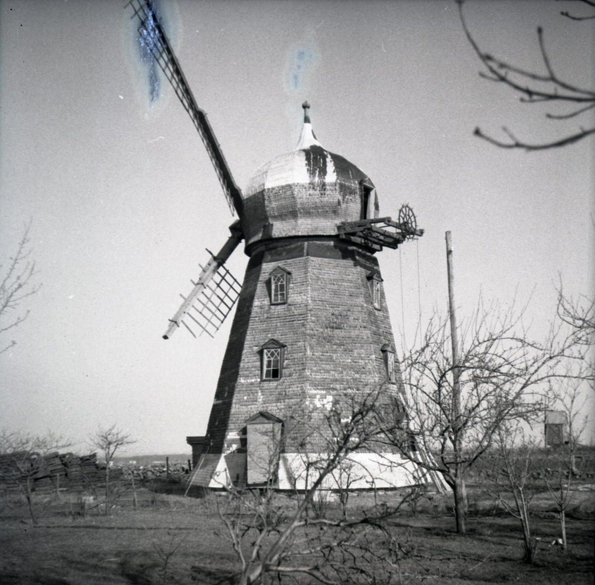 Holländsk kvarn strax ovanför vägskälet mellan stora landsvägen och Färjestadsvägen. Under reparation våren 1957. Vid en senare reparation har spånet på taket ersatts med plåt.