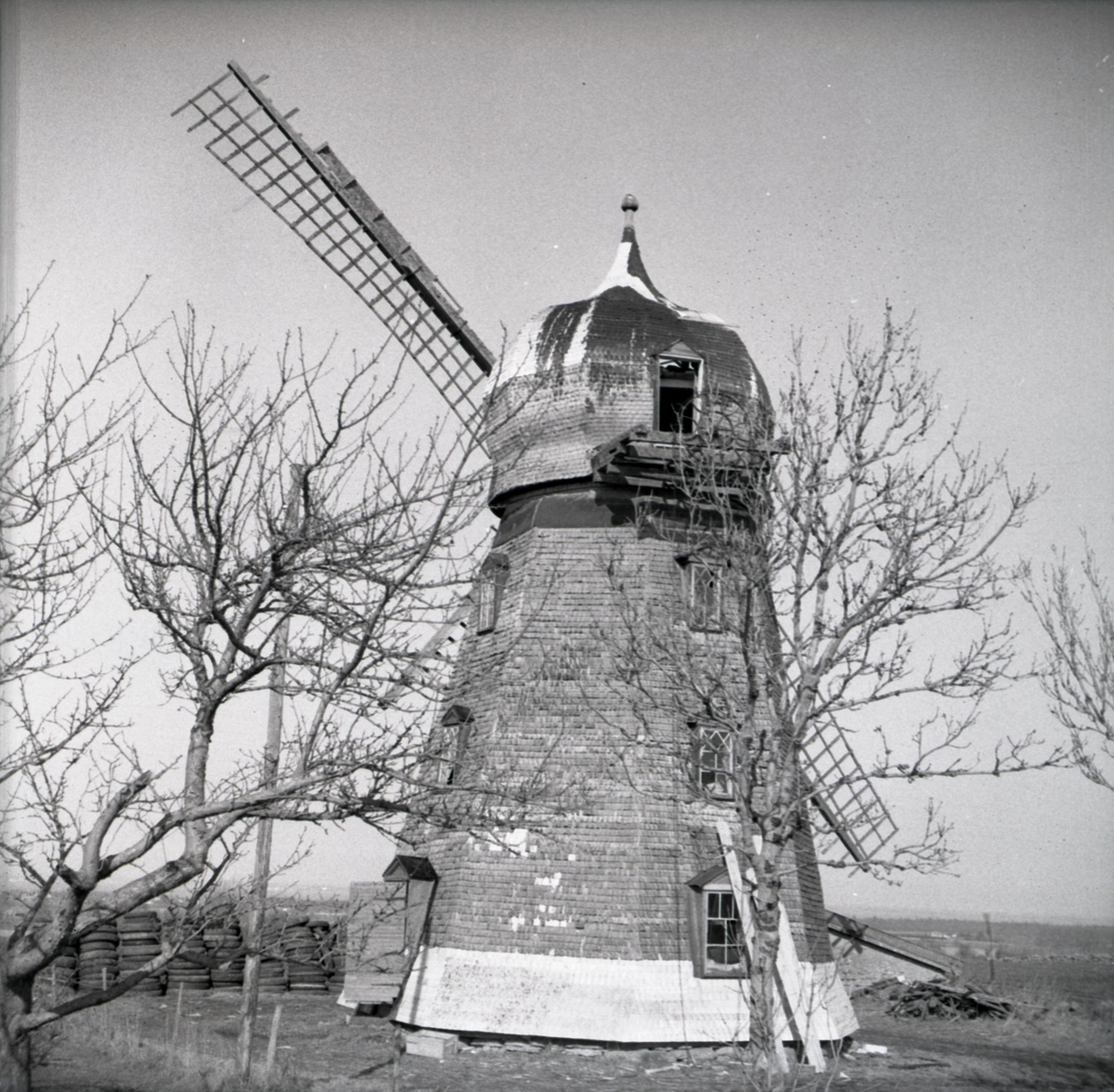 Holländsk kvarn strax ovanför vägskälet mellan stora landsvägen och Färjestadsvägen. Under reparation våren 1957. Vid en senare reparation har spånet på taket ersatts med plåt.