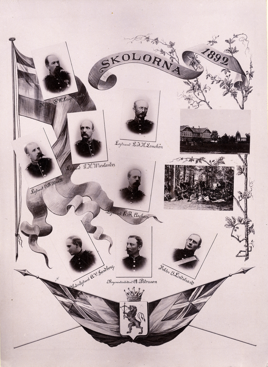 Gruppfoto av ett antal officerare/lärare, omgivna av unionsfanor, Smålands vapen och mindre foton på diverse byggnader på Kronobergs hed m.m.