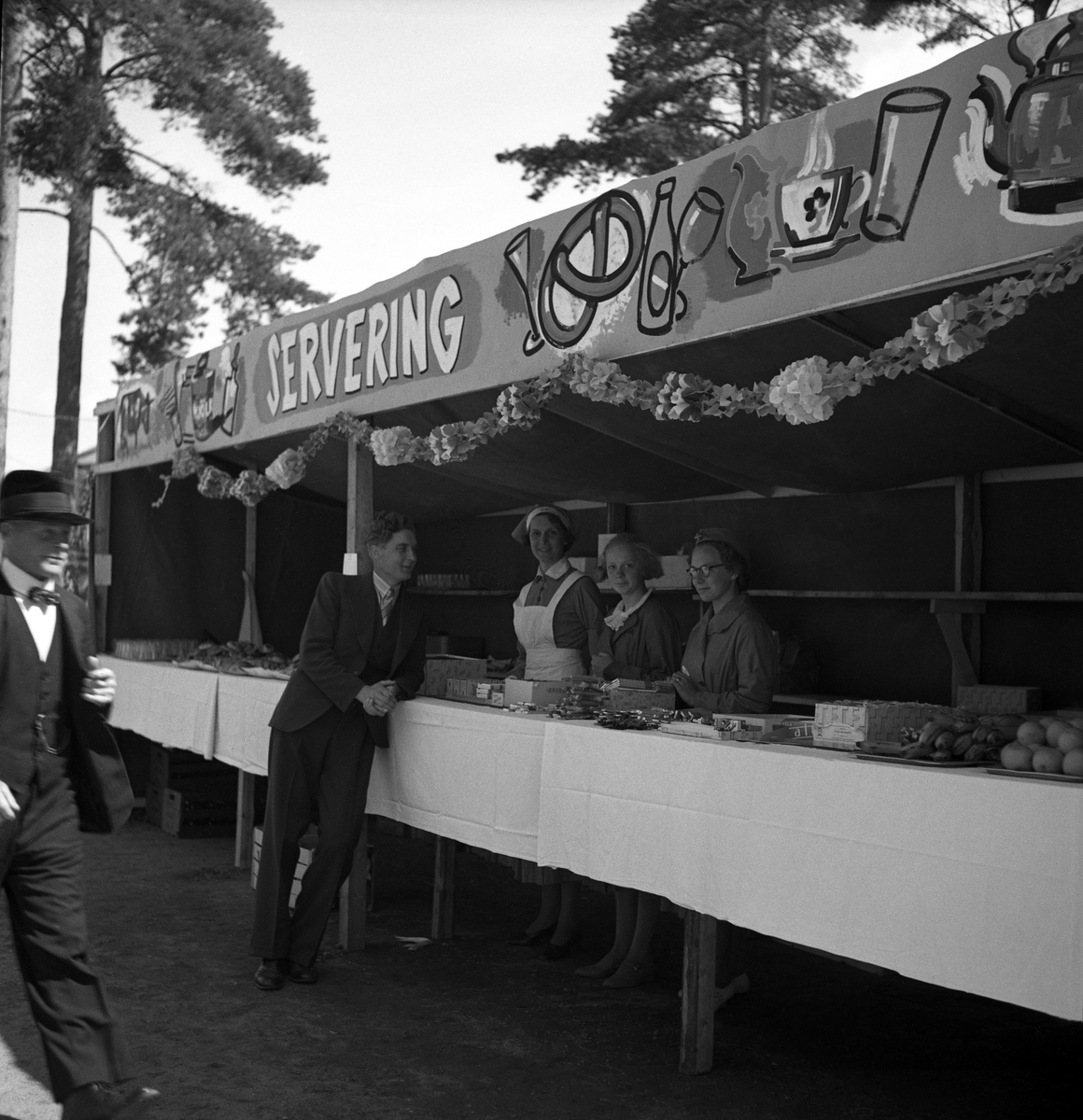 Kamratmötet, I 11. Servering vid övningsfältet. En man pratar med några lottor.
