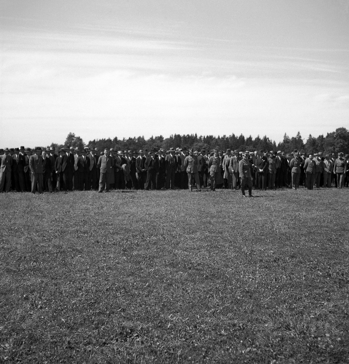 Kamratmötet, I 11. Äldre herrar i kostym och hatt, står uppställda på övningsfältet.