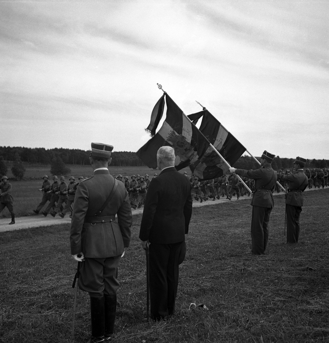 Kamratmötet, I 11. Övningsfältet. Förbidefilering av inryckt manskap i uniform. I förgrunden står några mannar med regementets fanor, jämte två andra herrar.