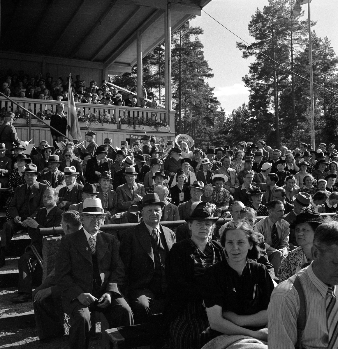Vy över läktare och publik på Värendsvallen. I bakgrunden skymtar en