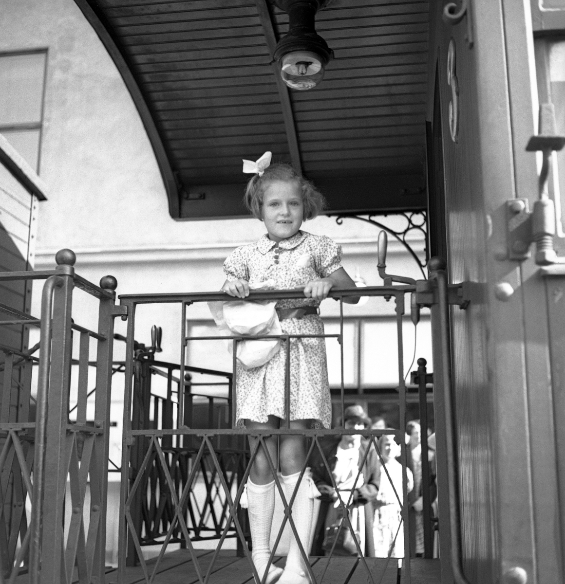En flicka poserar vid grinden till en tågvagn, på stationen i Växjö.