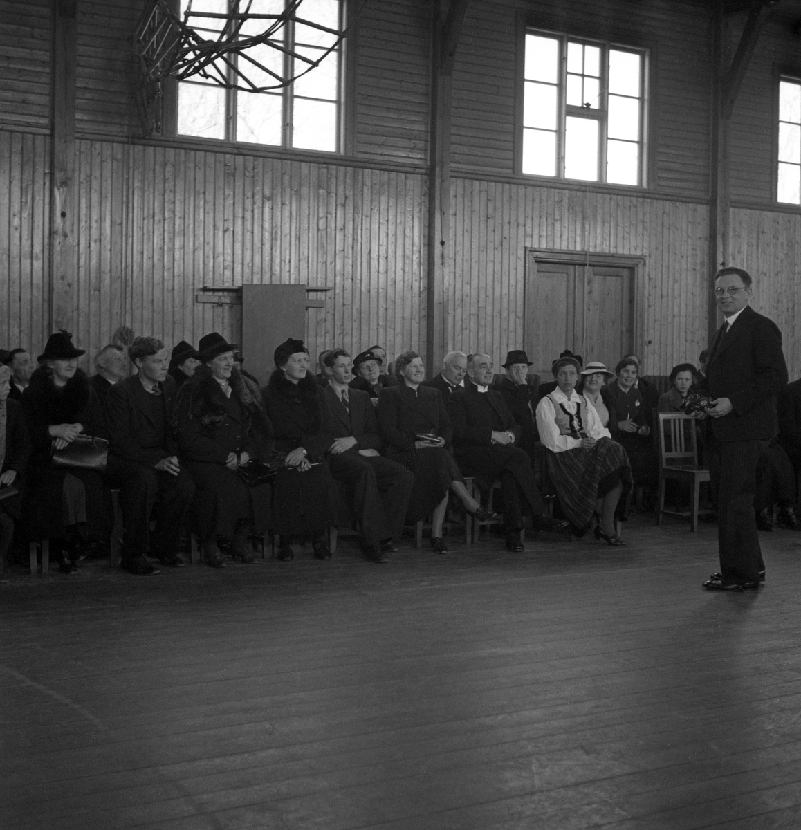 En man i glasögon och kostym, pratar om något framför en sittande publik, med bl a en präst till höger.