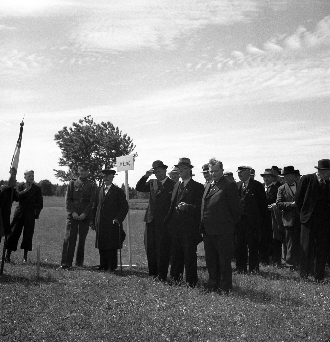 Kamratmötet, I 11. Samling på övningsfältet. Ett antal äldre herrar i kostym och hatt m.m., har ställt upp sig med kompanifanor m.m. En av herrarna pratar med en herre i uniform.