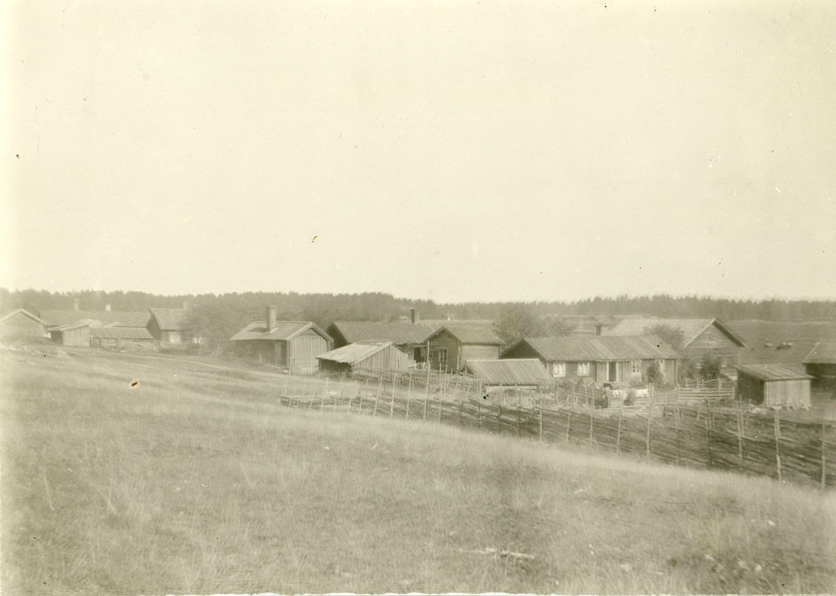 Landskap med bostäder och gärdsgård i bakgrunden.