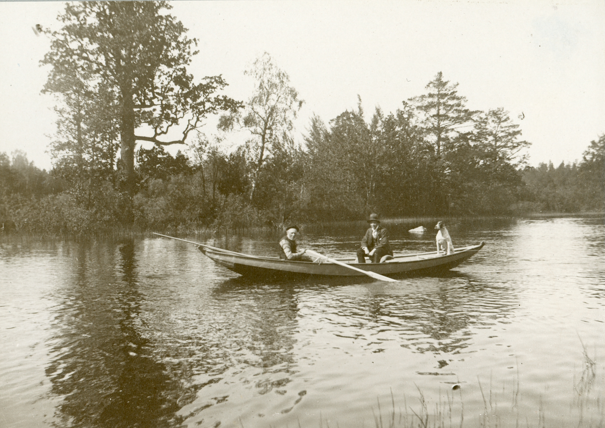 Två män och en hund i en eka, troligen i Dalälven, kanske ute för att fiska.