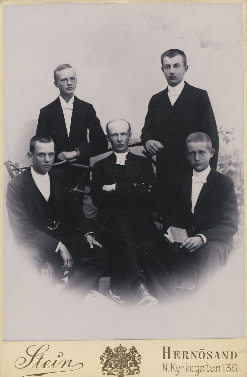 Grupporträtt med präst Otto Norberg samt sannolikt fyra konfirmander. Fotograf Stein, Härnösand.