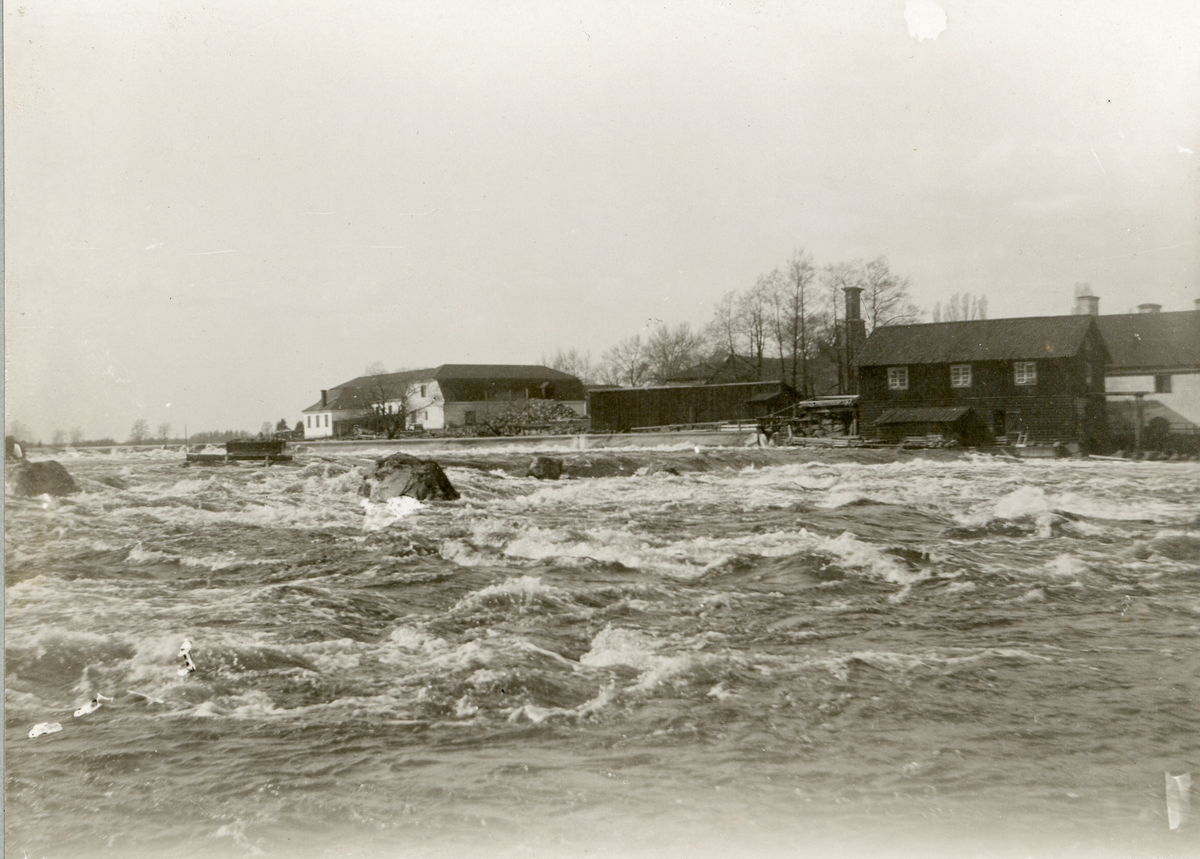 Titel: Forsen i Gysinge med bruksbyggnader i bakgrunden.