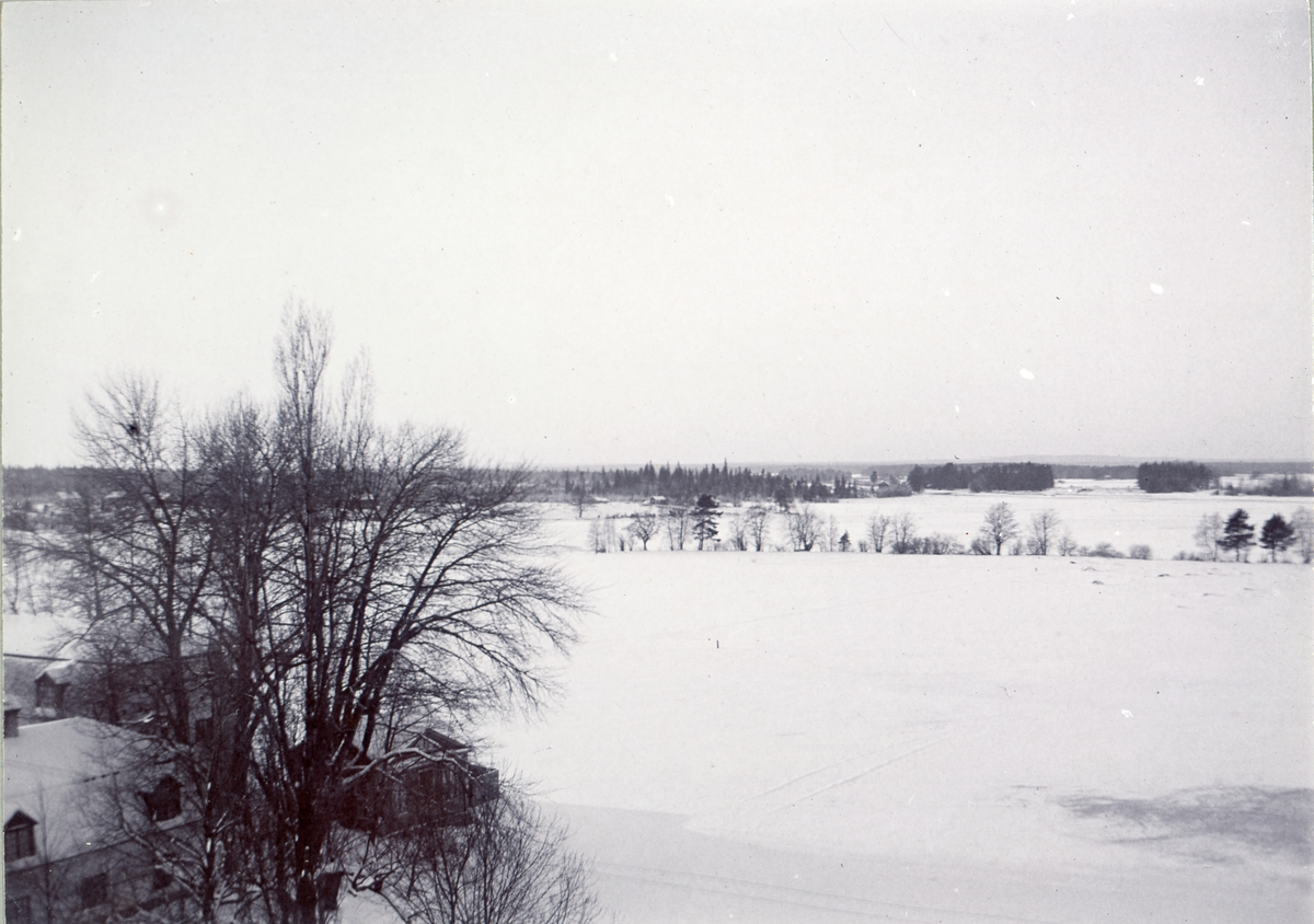 Titel: Bruksbyggnader från Gysinge till vänster i bild och ett vintrigt landskap.