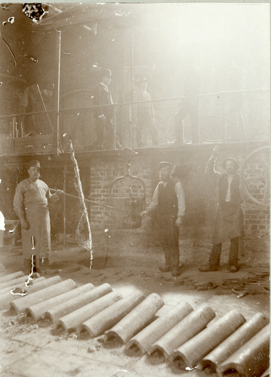Arbetare vid den Kjellinska induktionsugnen i Gysinge elektrostålverk, omkring 1902.