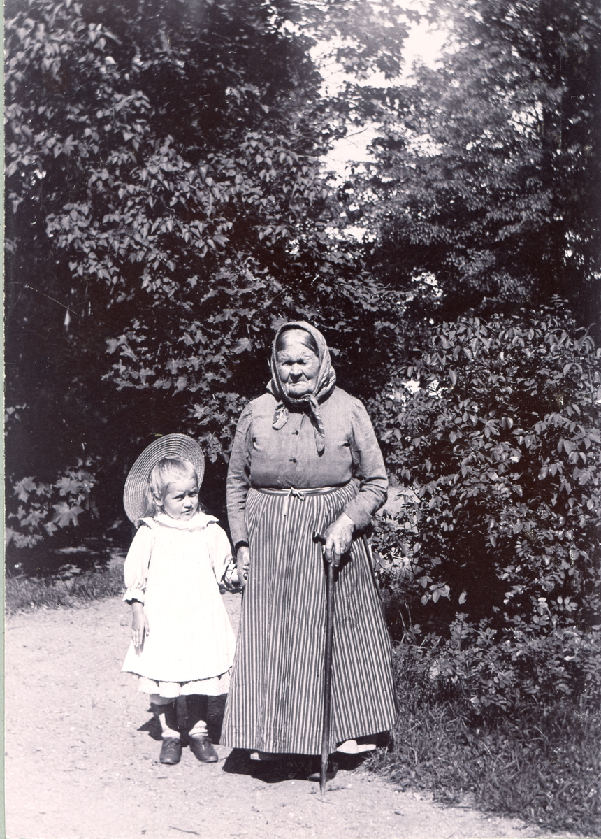 Kvinna med huckle och barn med stråhatt i herrgårdsparken i Gysinge.
