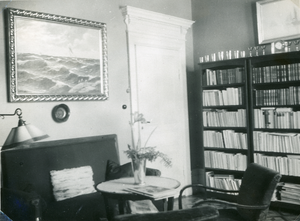 Titel: Rumsinteriör med soffa och karmstolar, tavla med ram, bokhyllor mm. troligen från Cenralpalatset i Gävle stad.
