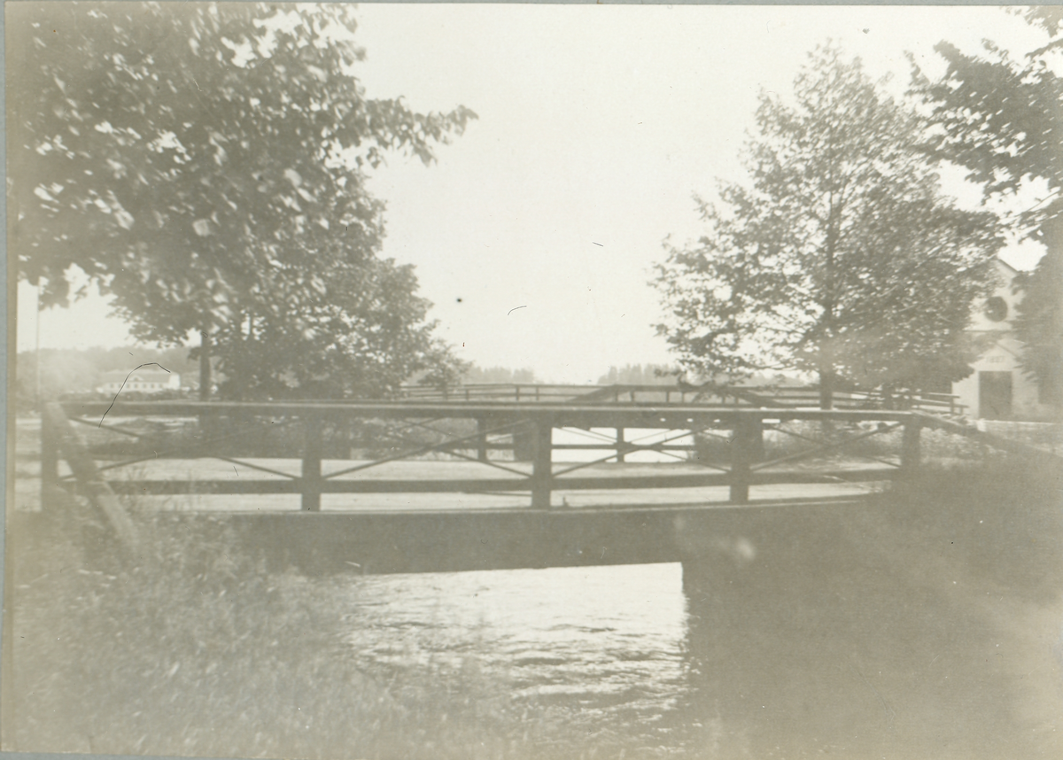 En pittoresk bro över vattendrag vid Gysinge bruk med bruksbyggnader i bakgrunden samt träd och buskar.