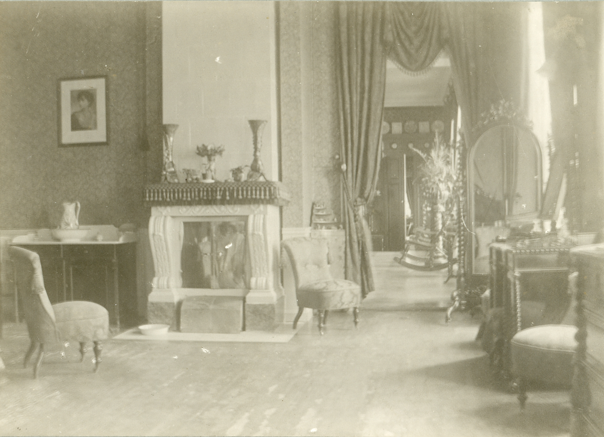 Foto visar ett rum med bl.a skåp med tvättfat och kanna, kakelugn, fåtölj, golvspegel, spegelbord mm. troligen sovrum, inifrån Gysinge herrgård.