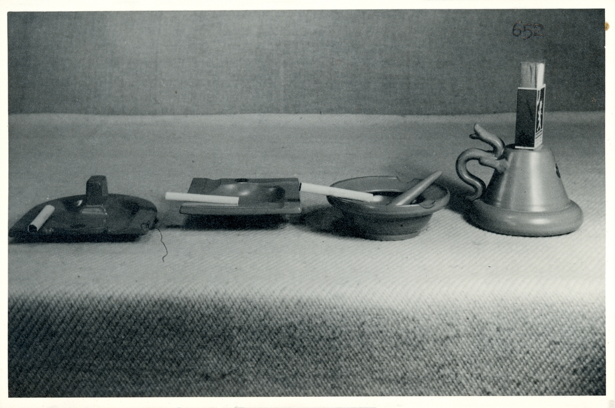 Askfat, askkopp och tändstickshållare från Bo Fajans, formgivna av Allan Ebeling och Eva Jancke-Björk.