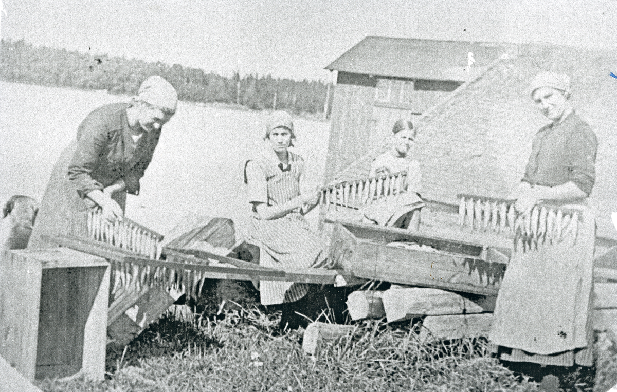 Fyra fiskarflickor som "spettar" strömming, fr.v Rut Nordin, Elna Berg, Greta Danielson, Elsa Nordin, 1919.