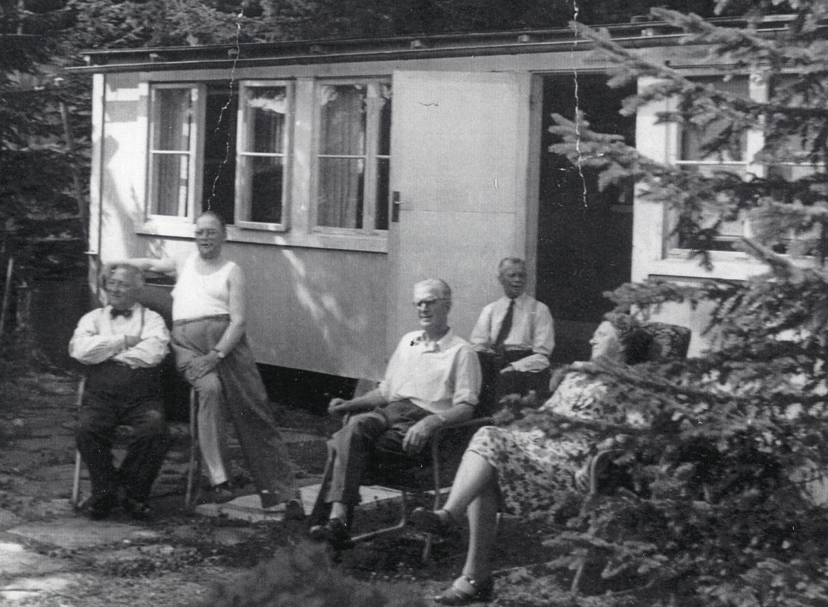 Titel: Folke Bäcklund sittandes med sällskap vid Bildstensharen, i bakgrunden en stuga och skog, 1930-tal.