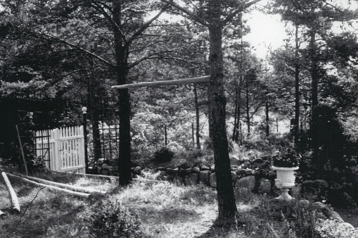 Stora entrén vid Limöhäll med en vit urna med blommor och ett vitt staket ligger inbäddad med många träd.