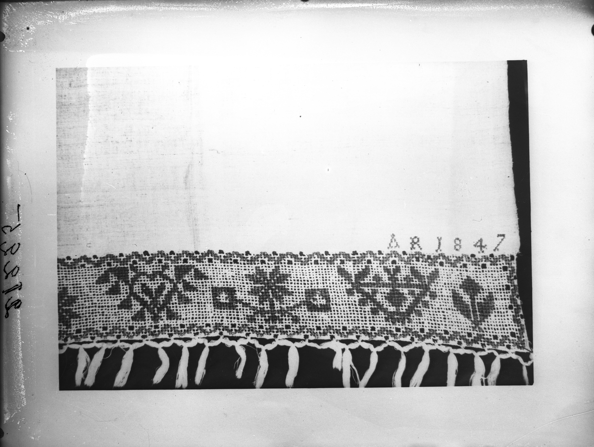 Bård av näversöm fäst vid linnelärft (hänglakan?), knuten frans, märkning "1847". Järbo.
