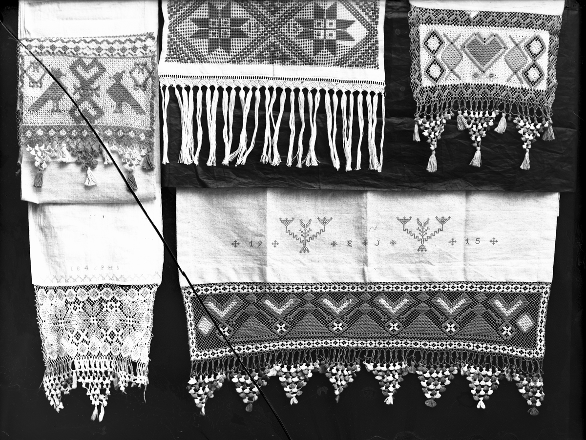 1 st hänglakan med bård i "pinnspets" med kläppfrans, "EJ 1915".
