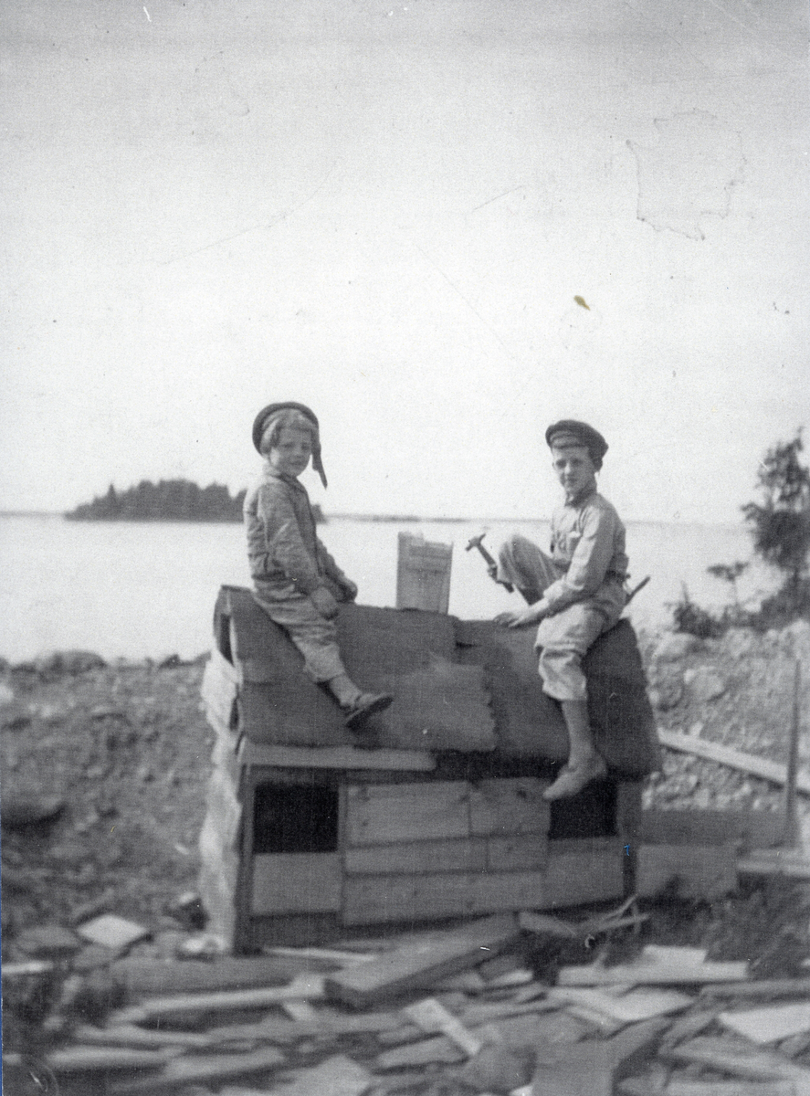 Olle och Sven bygger eget, sittandes på taknocken och med verktyg i handen. I bakgrunden syns en liten ö ute i vattnet. En liten kopia av stora "Limöhäll".
