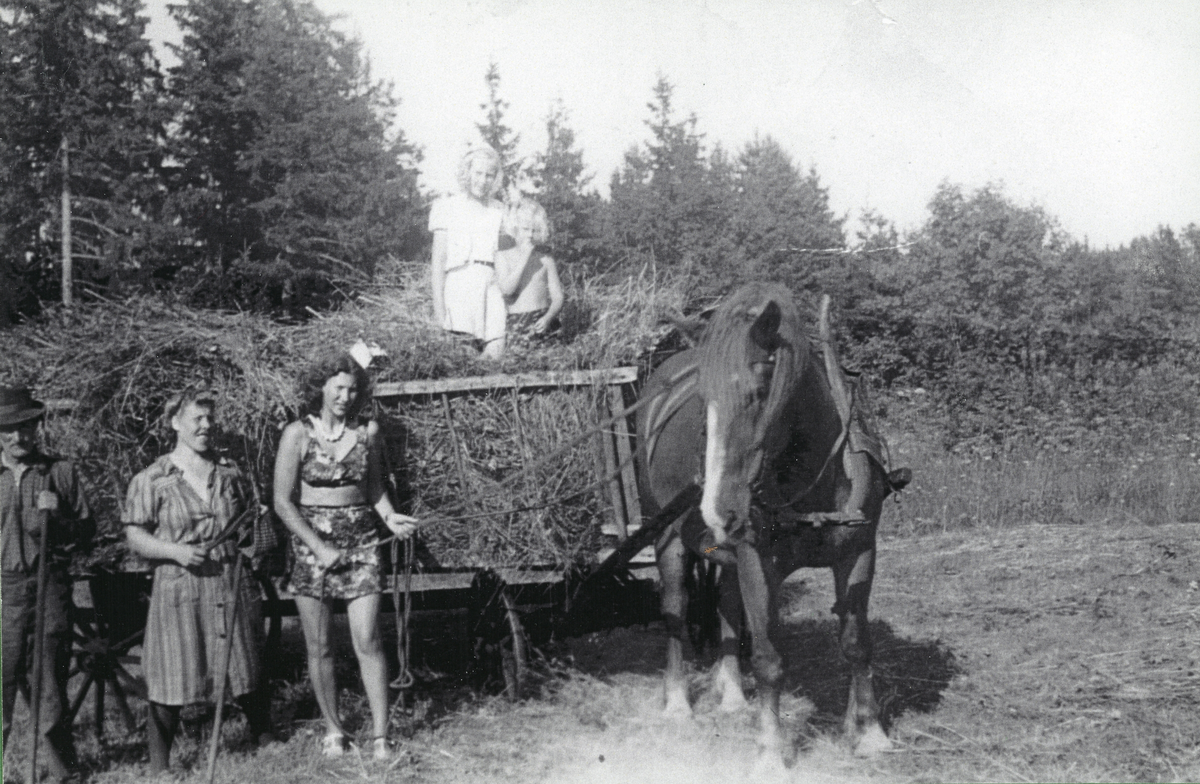 Titel: Full höskrinda, med Carl Eriksson och Alfhild till vänster samt en kvinna som håller i tömmar och två barn uppe i höskrindan, 1929.