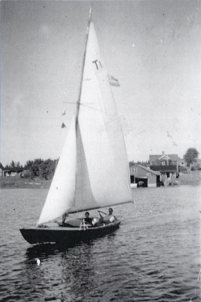 Båten "Trollungen I", läckerhet i Honduras-mahogny, ute på seglats, med rorsman Helge Stenmark och gast Stellan i båten. Sjöbodar och hus i bakgrunden på land.