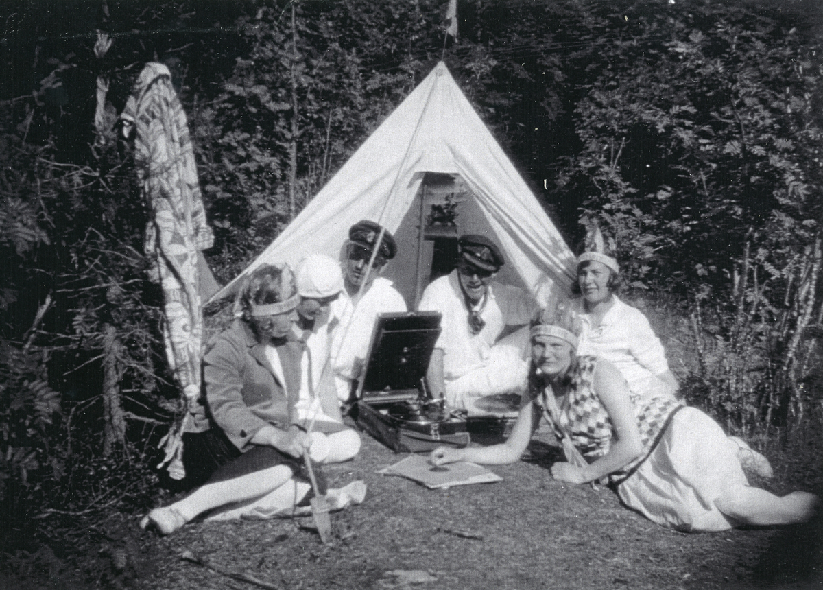 Johnny Mattsson med sällskap tältar på Oxharen. Fyra kvinnor och två män sitter framför ett tält med en gammal grammofon i mitten och spelar skivor.