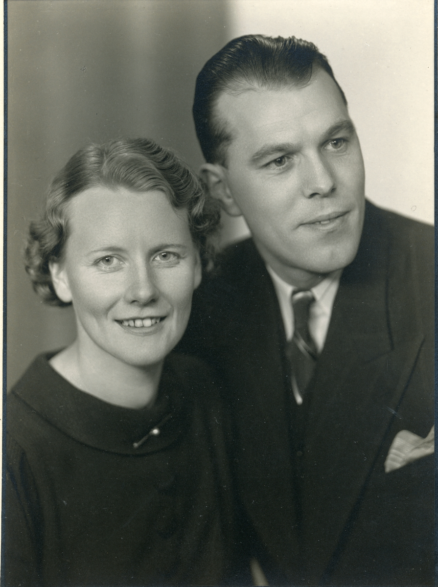 Titel: Porträttfoto på ett par, Marta Sörensson och Bror Olssson, fotograf Inga Undén, atelje Undén i Hudiksvall, 1938. På baksidan av fotot står det: "Bror arbetade i många år i verkstaden hos pappa, flyttade till Lindesberg".