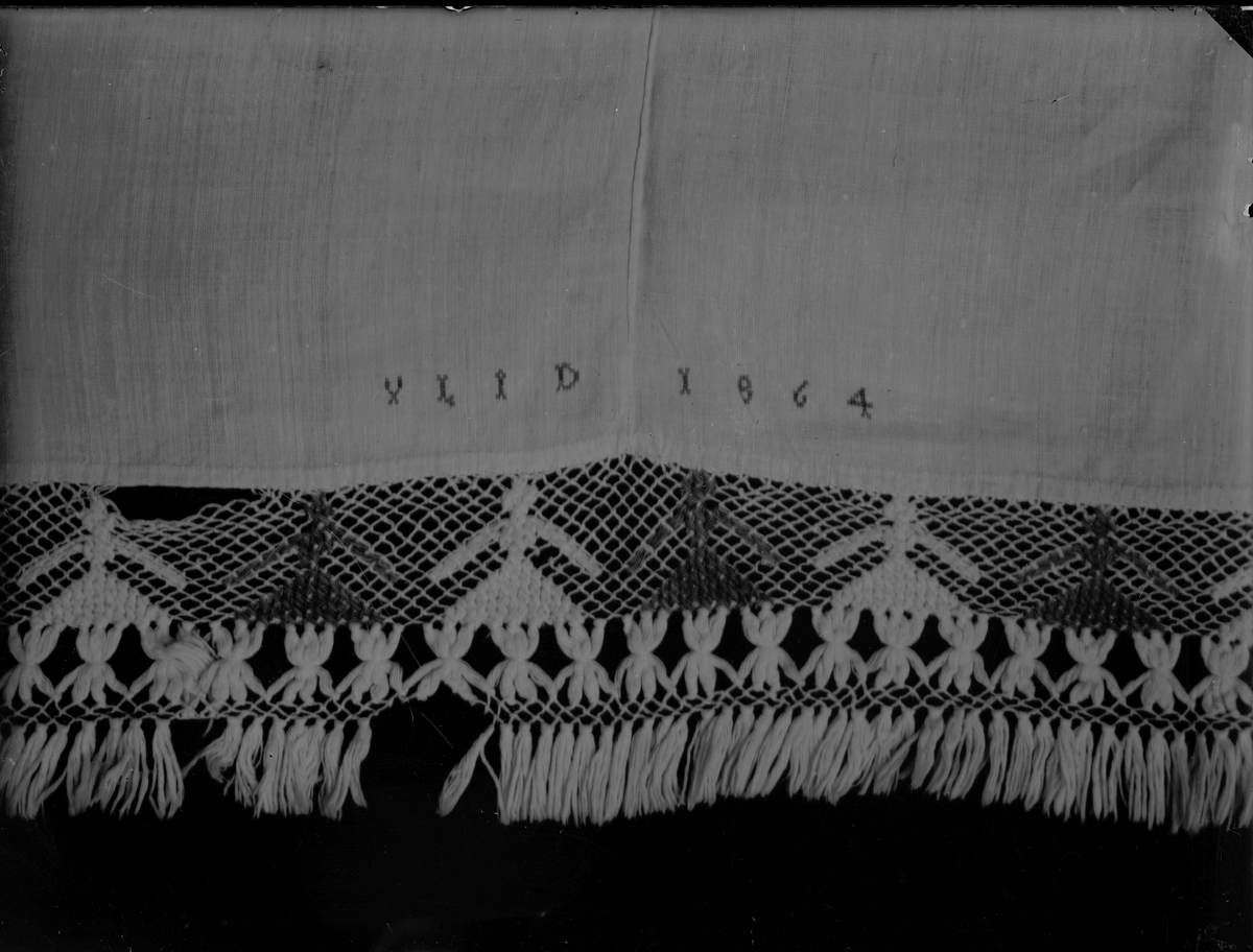 Hänglakan med bård i pinnspets, märkning i korssöm "_ LID 1864", frans. Ovansjö.