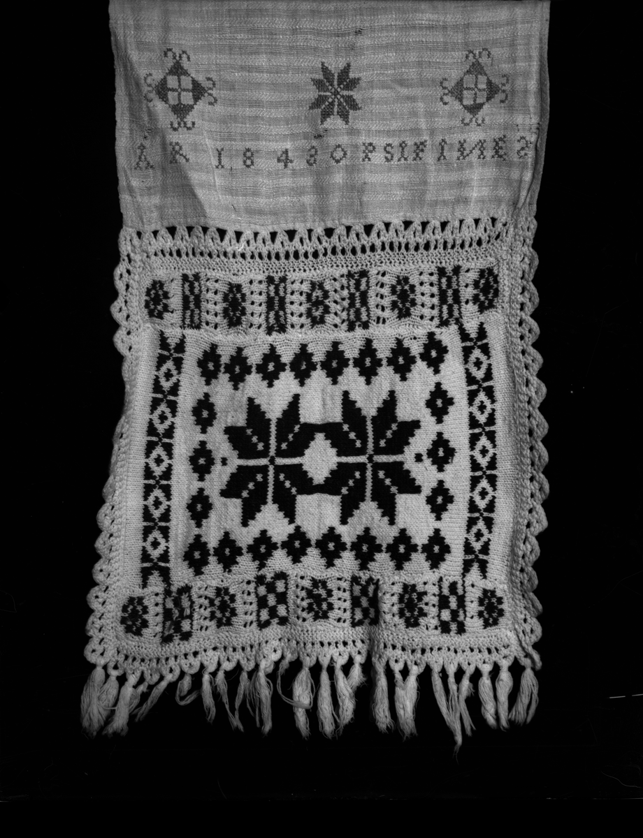 Handkläde av "tjock och tunnväv", broderier och märkning i korssöm "ÅR 1843 OPS I FINES", stickad flerfärgad bård, frans. Järbo.