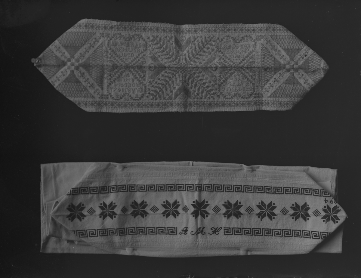 Örngottshuvor med broderier i korssöm, på den ena märkning med text i hjärtmönstren bl.a. "F B ER ÅR 1846 ÄR DENNA HUW", på den andra "AMK".