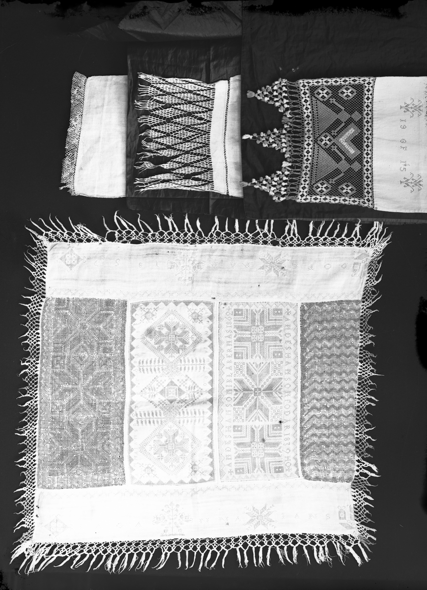 Duk hopsydd av 4 örngottshuvor och bård av hänglakan, knuten frans runt om. En märkt "AANDES HANSON FÖD ÅR 1839 HO" "ANDES HANSON I KLÅKERNÄS 1862".
