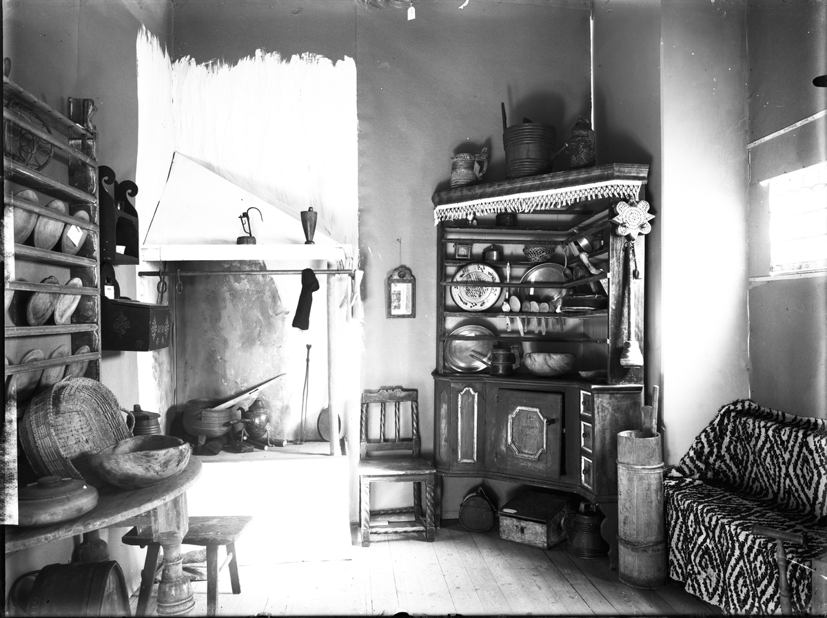 Hemslöjdsutställning uppbyggd som ett allmogekök med spis, möbler och allmogeföremål i trä. Väggskrin märkt "1850". (30)