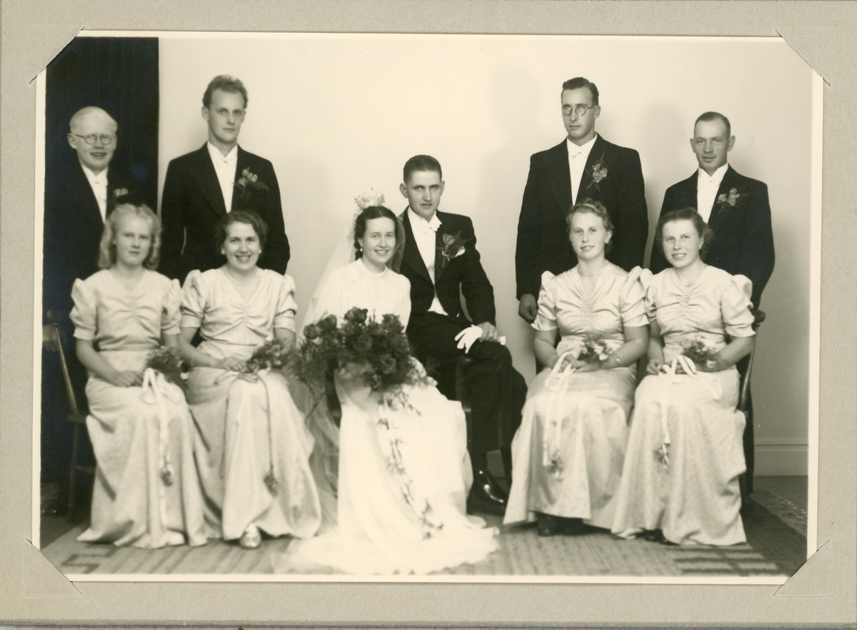På baksidan av fotografiet står det text som lyder "Anna Hansson, Bjuråker, Erik marskalk, "Krus-Anna" kallade vi bruden, avlägsen släkting"