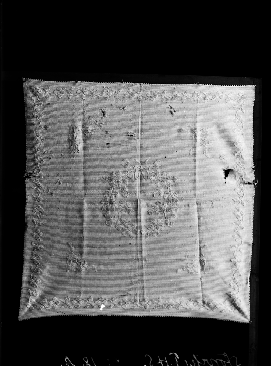Förningsduk, noppväv av bomull (75x78 cm) enl. Greta Hedlund, "Dräkt och kvinnlig slöjd i Ovansjö socken 1750-1860"(1951) s.229.
