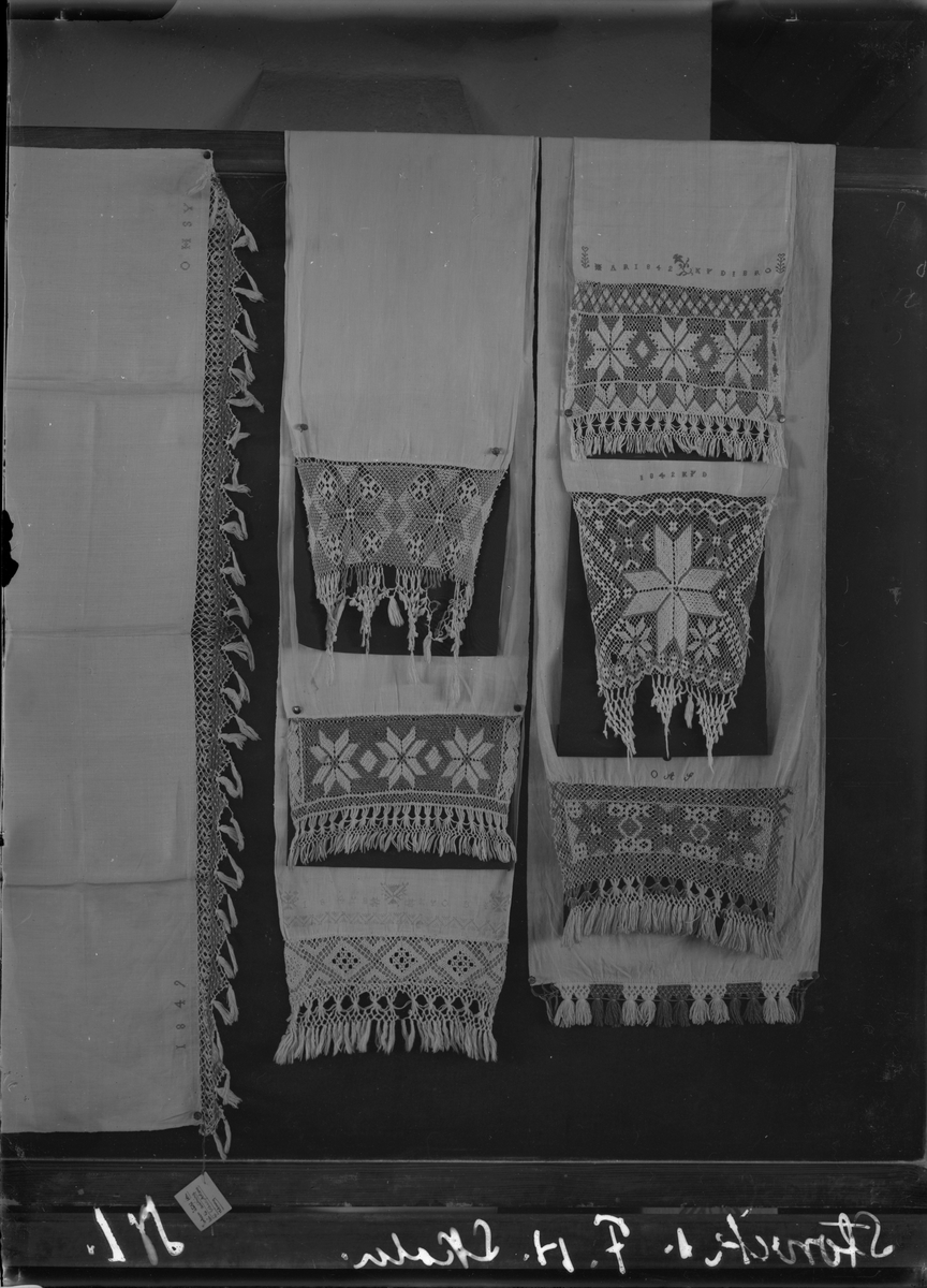 Hänglakan och handkläden med bårder av pinnspets. Ett handkläde har knypplad bård. Broderi i korssöm. Märkning: "1849 OHSY", "18 A 48 KY O B I", "ÅR 1842 KYD I BRO", "1842 KYD", "OAS".