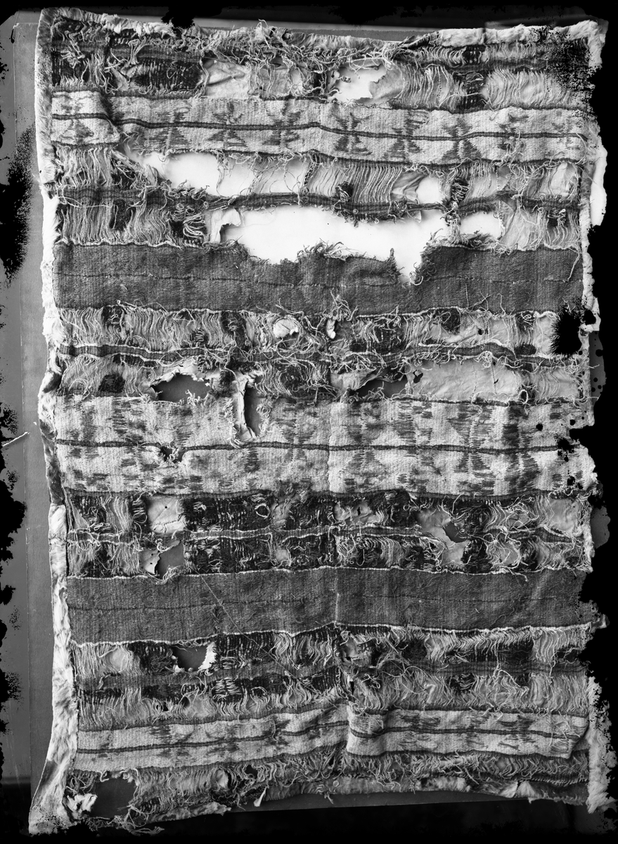 Vävnad, troligen täcke, vävt i krabbasnår hopsytt av två våder. Mycket sliten.