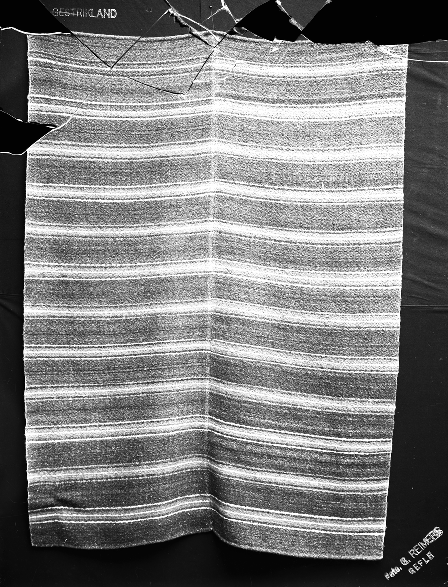 Täcke, vävt, tvärrandigt, hopsytt av två våder.