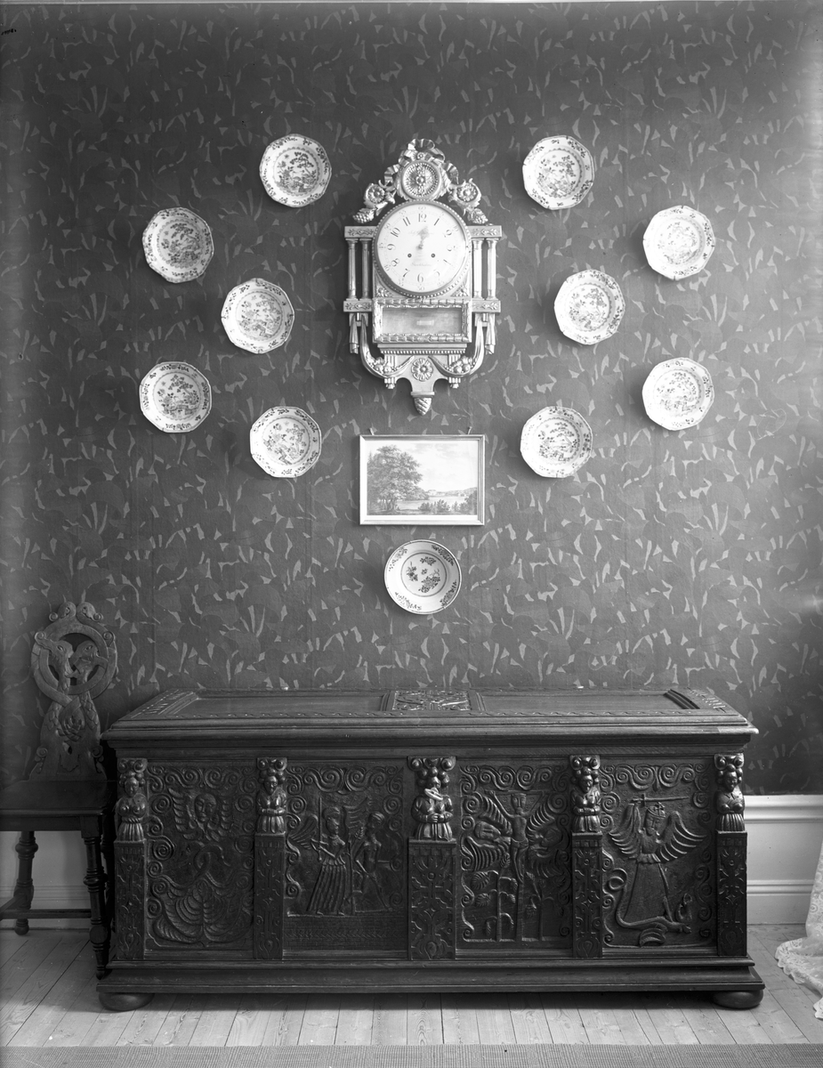 Interiör, snidad kista och stol samt väggur, tavla och tallrikar.