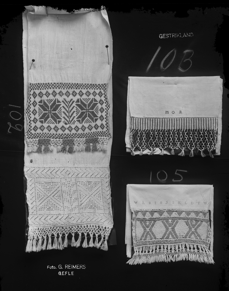 2 st handkläden med stickad bård (102). Handkläde med vävd bård, märkt "MOR" (103). Handkläde i knutet och trätt, (pinnspets) märkt "ÅR 1853 KLDT".