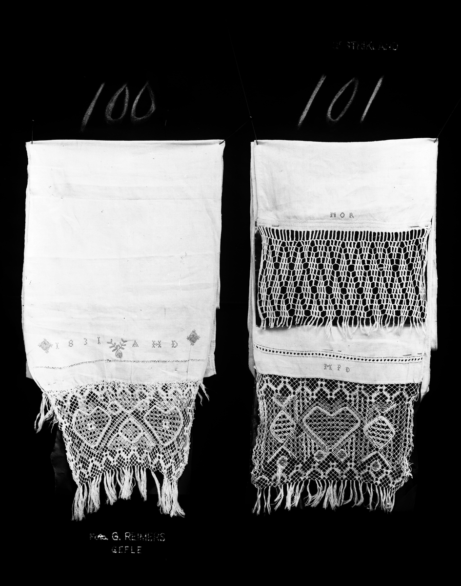 Handkläde med pinnspets märkt "MPD" (101).