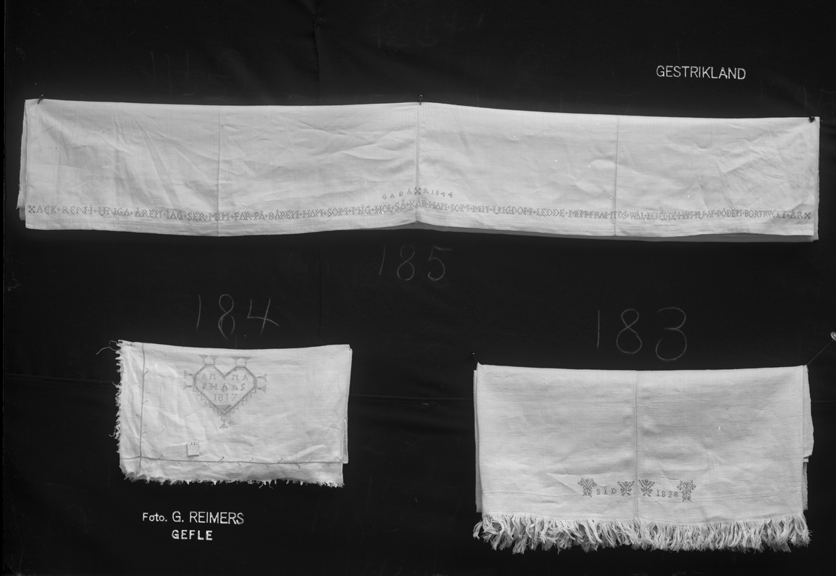 Okänt föremål med broderat hjärta och "ANNA, PHÅRS, 1817" i korssöm (184).